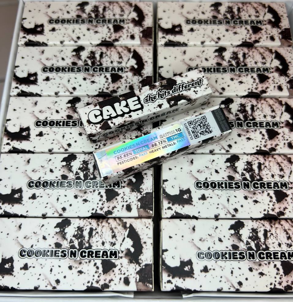 Cookies N Cream cake cart is an evenly balanced hybrid (60% indica/40% sativa) strain created through a cross of Starfighter X Unknown Girl Scout Cookies phenotype.